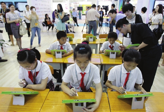 在演示上課的過程中,“老師”手執(zhí)平板電腦,“學(xué)生”的課桌上也每人有一臺平板電腦。“老師”播放的拔河比賽動畫,“學(xué)生”在自己的平板電腦上可以同步看到,并在電腦上完成習(xí)題。電腦系統(tǒng)后臺可以實現(xiàn)對每位學(xué)生所做客觀題的對錯進(jìn)行判分,并反饋到“老師”手中的電腦上,老師據(jù)此掌握到了每個學(xué)生課堂學(xué)習(xí)情況,并可以進(jìn)行重點教學(xué)和分層次教育。