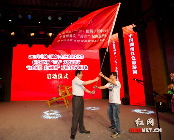 湖南省委常委、省委宣傳部部長許又聲[左]為“紅色通道 美麗侗寨”萬輛自駕車游懷化活動授旗。