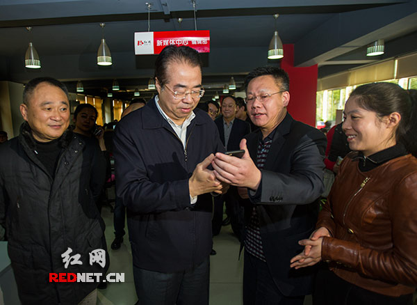 湖南省委常委、省委宣傳部部長許又聲[左二]一行來到紅網走訪、慰問,并體驗紅網“時刻”新聞客戶端。